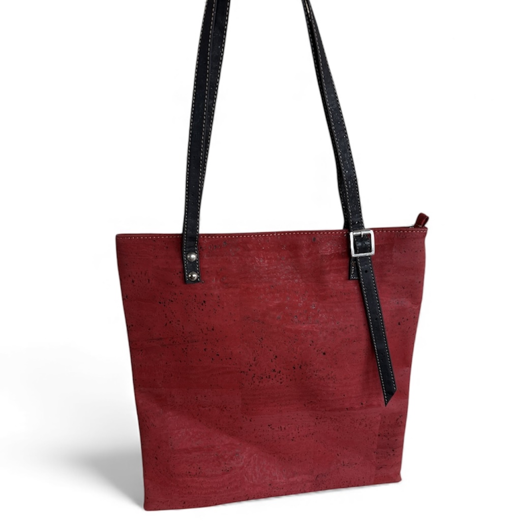 In deze tas past perfect een IPad. Uiteraard ook te gebruiken als Vegan handtas gemaakt van kurk uit Portugal. De tas is 32 cm hoog en 25 cm breed. De hengsels zijn ook van kurk en de tas sluit met een magneet aan de bovenzijde. Binnen is een groot vak en een klein vakje met rits. De tas is donker groen en donker bruin.