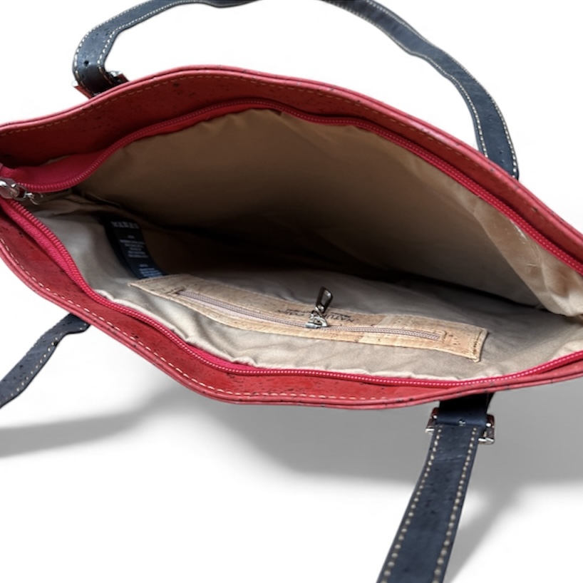 Veganistische handtas van Montado. De tas heeft een groot vak met daarin twee vakken zonder rits en één vak met rits. Bij de productie van deze tas is geen enkel dierlijk materiaal gebruikt. – 100% diervrij, PETA-gekeurd veganistisch materiaal – Duurzame, FSC®-gecertificeerde kurk – Product gemaakt in Portugal met Portugese kurk. – Milieuvriendelijk, duurzaam, waterbestendig, sterk en lekker zacht.
